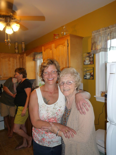| When we decided we were going to go back home for a visit I called my cousin Sandra to let her know we were coming. She said there was going to be a birthday celebration for her mom..my Aunt Eva, my Dad's sister. She invited us to her 75th birthday party. This is when it turns into a mini family reunion, my Uncle Ralphie from Halifax (I have not seen him since I was about 12) my Aunt Ralphina from Halifax who I last saw 4 yrs ago for the first time in 32 yrs, Ralphie's son Ryan, whom I have never met, his adorable 3 yr old son and his cute girlfriend. My cousin Anne Marie from Ontario ( I have not seen since I was 16) and her charming and beautiful daughter. My cousin Mary Catherine and husband were also there from Halifax. We went out for a nice dinner at a local restaurant and then went back to Sandra's for cake. |